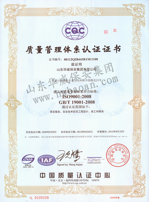 ISO9001質(zhì)量管理體系認證證書